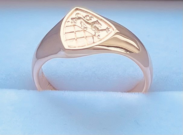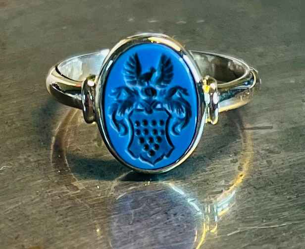 ← Zurück zu: Übersicht Siegelringe Heliotrop Rotgold graviert Topas Unterbau facettiert blauer Lagenstein Carneol